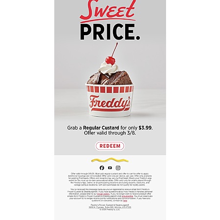 Additional toppings are not included. Offer valid one per device, per user. Offer only available for existing Fredheads. Offers and rewards may vary by FredHead. Check your Freddy's app wallet for the most up-to-date personalized deals. Offer valid only for orders placed through the Freddy's App, online, or at participating locations (excluding airports, stadiums, and college campus locations). Gift card purchases do not qualify for loyalty points.
