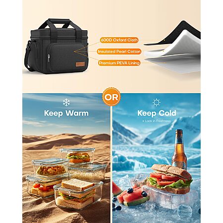 • LONG-LASTING INSULATION: This HOTOR insulated lunch box uses a 3-layer insulation system: the outer layer is 600D sturdy Oxford cloth, the middle layer is 3mm thick thermal insulation pearl cotton, and the inner layer is food-safe PEVA material. This lunch bag can effectively keep warm and cold, ensuring that drinks or food remain at the ideal temperature, which meets your needs for going out all day.