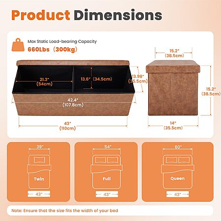 - 【Premium & Durable Build】The black Sweetcrispy storage ottoman features chic Lychee Grain Leather, while brown uses sleek Synthetic Leather—both super comfy and built to last. No flimsy stuff here! We use 4 layers of reinforced material with 9mm-thick edges, supporting up to 660 lbs without extra nails. Just sturdy Sweetcrispy quality! 【Sets Up in Seconds & Saves Space】Don't sweat assembly! Your Sweetcrispy ottoman with storage folds flat when you're done using it—slide it under your bed, prop it in a closet, or stash it anywhere. Seriously, unfold → snap the base → load it up → done. That's it! 【Cloud-Like Comfort】Sink into the 1-inch (2.5cm) memory foam seat—it's soft, supportive, and bounces back fast. And yeah, it still holds 660 lbs thanks to our heavy-duty MDF frame. Sweetcrispy = comfy + strong! 【Massive Storage (Way Bigger Than Most!)】Tired of tiny storage bins? Sweetcrispy's got you:Small: 29 Gal (110L)/Large: 42 Gal (159L)—includes a Velcro divider to organize shoes, books, or small parts!Just unfold, pop in the base, and fill 'er up. Hello, tidy space! 【Works Anywhere You Do】Bedroom bedside storage bench? Check. Living room foot rest stool? Yep. Entryway shoe storage bench? Absolutely! Your Sweetcrispy ottoman bends to your life. Netflix marathon? Guest shoes? Seasonal supplies? Sorted.