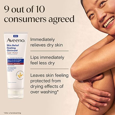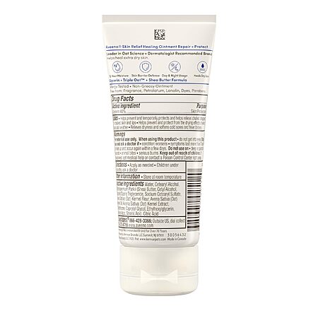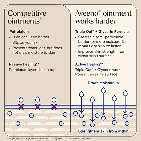 • Help relieve chafed, chapped, or cracked skin with Aveeno Skin Relief Healing Ointment. This fragrance-free ointment and glycerin skin protectant repairs dry skin 2X faster and protects it for longer* while helping protect from the drying effects of wind and cold weather. Formulated with a soothing Triple Oat complex, oat flour, oat oil, oat extract, plus shea butter and glycerin, this dry skin ointment is clinically proven to lock in moisture for up to 72 hours and to help strengthen the skin's natural moisture barrier. This skin healing ointment is non-greasy, fragrance-free, and suitable for sensitive skin. Suitable for day and night use, apply as needed to the body, face, hands, and lips. The Aveeno Skin Relief Ointment is allergy-tested and free from petroleum, lanolin, dyes, and parabens. From Aveeno, a dermatologist-recommended skin care brand and leader in oat science. *compared to bare skin