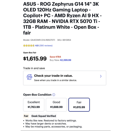 $1616 YMMV Open Box ASUS ROG Zephyrus G14 Laptop: 14" 3K 120Hz OLED, AI 9 HX 370, RTX 5070 Ti $1615.99