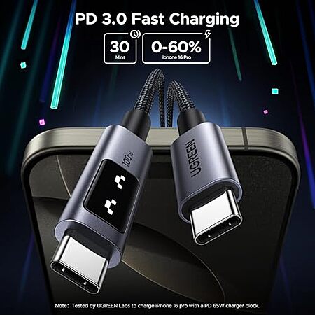$9.35* | 6.6' UGREEN Uno 100W USB-C Fast Charging Cable w/ LED Display at Amazon