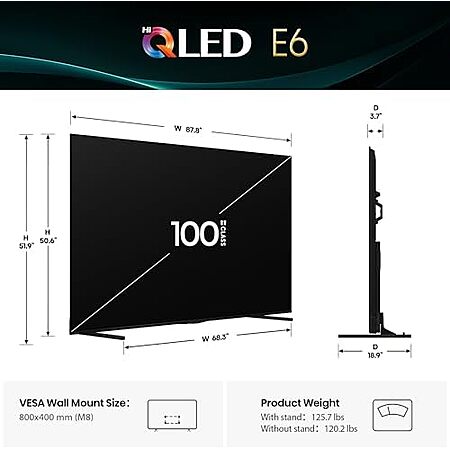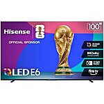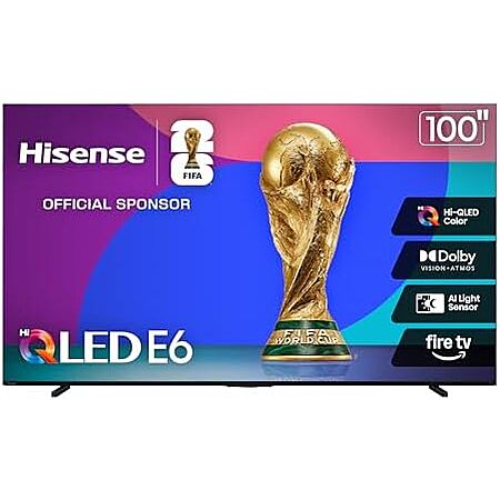 Model: Hisense 100" E6 Cinema Series QLED 4K UHD Smart Fire TV (100E6QF, 2025 Model) - QLED, Native 144Hz, Dolby Vision IQ · Atmos, Motion Rate 240, HDR 10+, Game Mode Pro, Voice Remote with Alexa