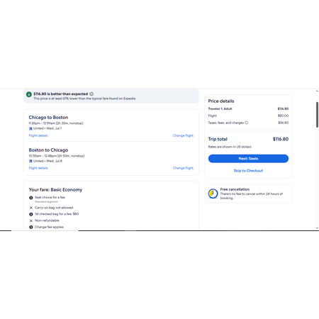 JetBlue, American Airlines, Delta Air Lines and Expedia have round trip airfares travelling to and from Chicago (ORD) and Boston (BOS) for $117, nonstop. These are basic economy fares that allow a personal item and a carry-on bag. There is no seat selection and no change.