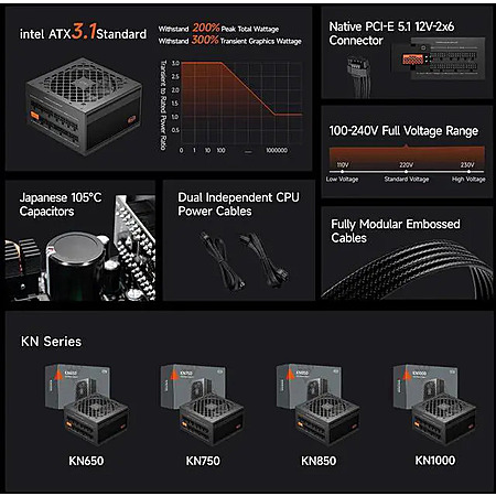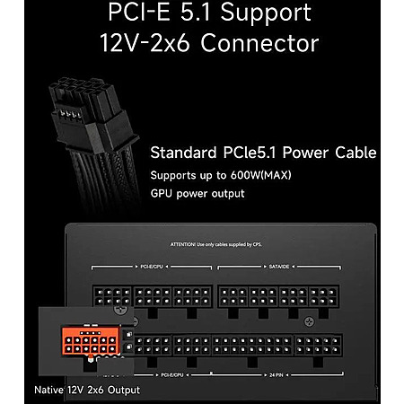 The PCCOOLER CPS KN850 is an advanced fully modular power supply designed for high-performance computer systems. With an impressive 850W output, this power supply unit (PSU) is 80 PLUS Gold certified, ensuring high energy efficiency and reduced electricity costs. It is engineered to meet the demands of modern computing with its compatibility with ATX 3.1 and PCIe 5.1 standards, featuring a native 12V-2x6 connector capable of delivering up to 600W.