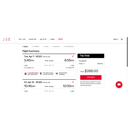 Apex rated 5* JSX, an independent regional 'business class-like' airline have service between Los Angeles (LAX) and Las Vegas (LAS) for $199, each way or $398 round trip. On JSX, you just need to arrive 20 mins before your flight avoiding long lines and enjoying business class amenities such as complimentary drinks and snacks, in-flight cocktails, 2 free checked bags and Starlink wifi.