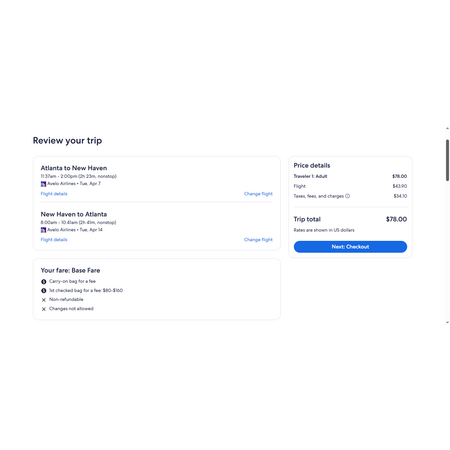 Avelo Airlines, an ultra low cost air carrier and Expedia have round trip airfares travelling to and from Atlanta (ATL) and New Haven CT (HVN) for $78, nonstop. There is no seat selection and no carry-on bag allowance. You may bring a small personal item that fits under the seat in front of you. Additional fees for carry-on and checked bags, advanced seat selection and other optional services may apply.