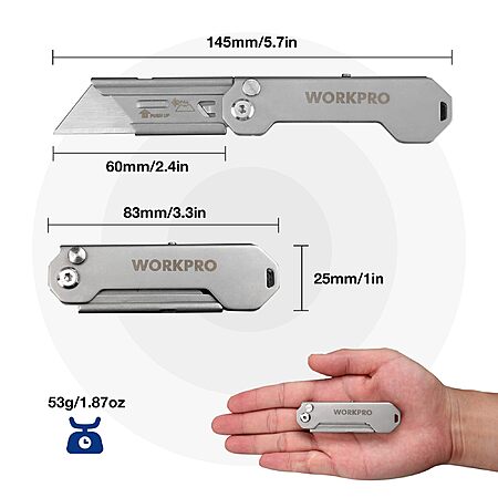 UE Direct via Amazon has for Prime Members: 2-Pack WORKPRO EDC Folding Utility Knife Mini Box Cutter w/ Quick Open Axis Lock, Belt Clip & 10 Blades on sale for $9.98. Shipping is free.