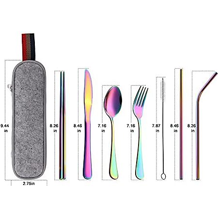 Model: DEVICO Portable Utensils, Travel Camping Cutlery Set, 8-Piece including Knife Fork Spoon Chopsticks Cleaning Brush Straws Portable Case, Stainless Steel Flatware set (Rainbow)