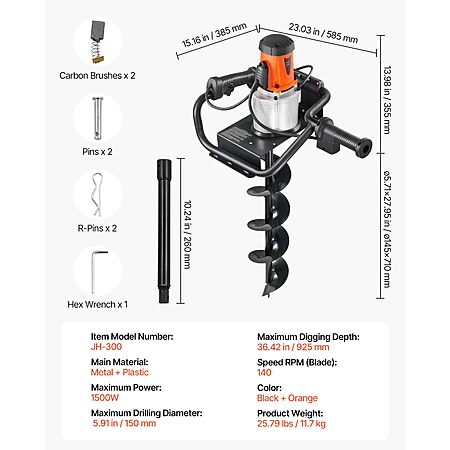 - Powerful Performance: This electric post hole digger is equipped with a high-power 1500W motor, capable of drilling holes up to 5.91 in (150 mm) in diameter and 36.42 in (925 mm) deep. Whether dealing with hard soil or soft earth, it delivers stable and efficient drilling power, making it easy to complete tasks like fence installation or tree planting for home or farm projects