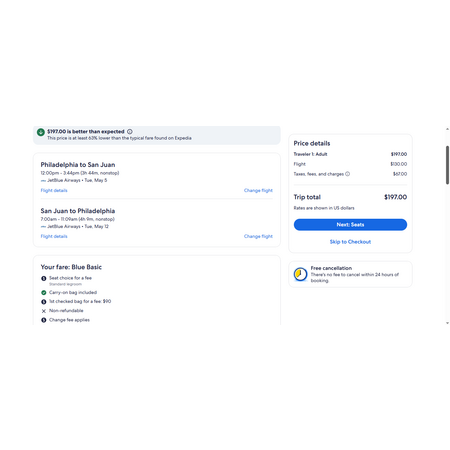 JetBlue and Expedia have round trip airfares travelling to and from Philadelphia (PHL) and San Juan Puerto Rico (SJU) for $197, nonstop. These are basic economy fares that allow a personal item and a carry-on bag. There is no seat selection and no change. If you are travelling with children, you will be seated together as per JetBlue's policy.