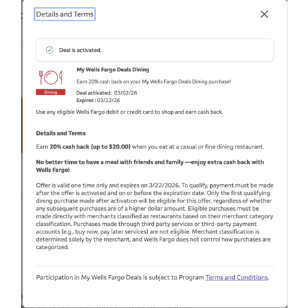 It looks like some Wells Fargo Credit Cards have a offer that is 20% cash back up to $20 on dining.