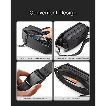 - Layered Structure and 19 Zones: This compact sling bag adopts a layered structure with 19 functional zones. Both the front and rear have concealed zippered pockets for important items. The front pocket includes small pockets and a webbing key hook. The rear pocket has three card slots for quick access of IDs, credit cards, and more. Additionally, there is an interlayer between the front and rear pockets for storing items like umbrellas and achieving dry and wet separation