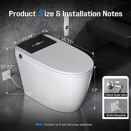 š ļø [Easy Installation, Warranty & Purchase Notes] This one piece toilet fits a standard 12-inch rough-in and includes full installation accessories with an illustrated manualāDIY-friendly, no plumber required. Backed by 12-month free replacement parts service and 24/7 customer support for peace of mind. Before ordering, please ensure your bathroom has a nearby power outlet and that the rough-in (pit distance) is sufficient for installation.