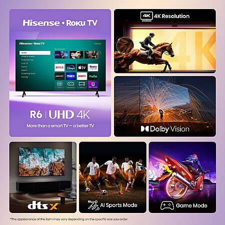 | Product Description: | The Hisense Roku TV R6 Series packs incredible details into a 4K Ultra High Definition picture. The R6 series also features High Dynamic Range (HDR) that boosts color and contrast, and Motion Rate 120 technology which makes it easier to follow fast action scenes. Plus, with Roku TV operating system (OS), it's easier to watch what you love with access to thousands of streaming channels, apps, and live TV. Giving everyone in your household something to enjoy. 4K UltraHD - Delivers more than four times the resolution of a regular 1080p high - definition screen. Along with over 8.3 million pixels, inside you’ll find a powerful full array LED backlight at work creating a sharper, more colorful picture. ROKU TV OS - Watch. Stream. Play. Listen. Laugh. Repeat. Kick back and enjoy streaming movies and TV episodes, plus live - streaming news, TV, sports and more, across thousands of free and paid channels. Start streaming your favorite shows. Access your cable box or HDTV antenna. Even fire up your gaming console — all from the simple home screen. Works with Google Assistant and Alexa - Quickly access entertainment and control your TV with a Google Assistant or Alexa device that you already own. With the touch of your remote or ROKU mobile app, or a simple voice command, you can take control of your smart home, turn on and off the TV, change channels, and much more. DTS® Studio Sound™ - DTS Studio Sound creates virtual surround sound for a crisp and immersive audio experience. Dolby Vision™ HDR and HDR10* - Dolby Vision HDR and HDR10 transforms your TV into an entertainment powerhouse. The image technology from cinemas, now brought together in the home, provide amazing realism that you'll see, hear, and feel like never before. Motion Rate 120 - Don’t struggle to keep your eye on the ball—enjoy fast-paced sports, movies and 4K gaming without the lag. Featuring Motion Rate image processing technology, the R6 keeps the thrills coming by making it easy to follow fast-moving action. Gaming Mode - Enjoy a better gaming experience. In Game Mode, input lag is significantly improved, so your commands from the controller are virtually instantaneous on the screen. Bezel-less Design - The R6 is designed with a gorgeous bezel-less design to give you more viewable screen area. |