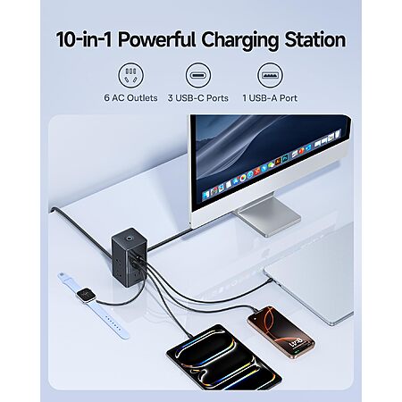 Model: Baseus Charging Station 67W, 10-in-1 USB-C PD Fast Charging Desktop Charger with 1200J Surge Protection, 5ft Extension Cord, 6 AC, 3 USBC, 1 USBA Ports for iPhone 16/15, MacBook, Tablet, Desktop