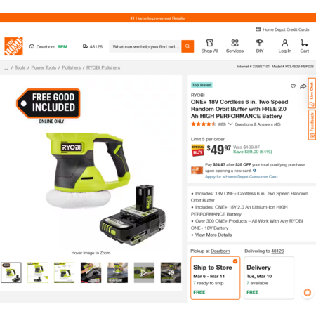 Model: ONE+ 18V Cordless 6 in. Two Speed Random Orbit Buffer with FREE 2.0 Ah HIGH PERFORMANCE Battery