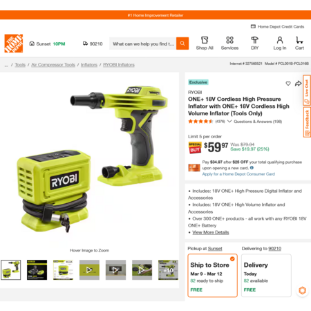 RYOBI ONE+ 18V Cordless High Pressure Inflator with ONE+ 18V Cordless High Volume Inflator (Tools Only) $59.97