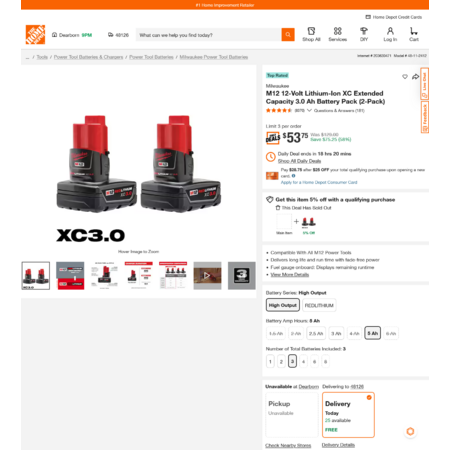 YMMV - Select HD Locations: Milwaukee M12 12-Volt Lithium-Ion XC Extended Capacity 3.0 Ah Battery Pack (2-Pack). Free Delivery $53.75