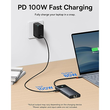 PD 100W Power Delivery for Stable Charging: The USB-C PD port supports up to 100W input, delivering up to 85W charging power to keep your laptop powered during use. This usb c docking station supports stable performance while connected to multiple devices. Note: Power adapter and input cable are not included.
