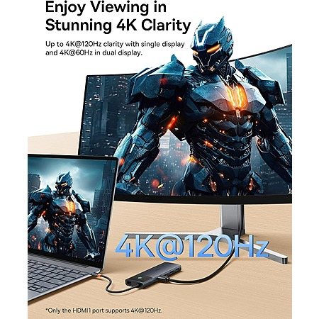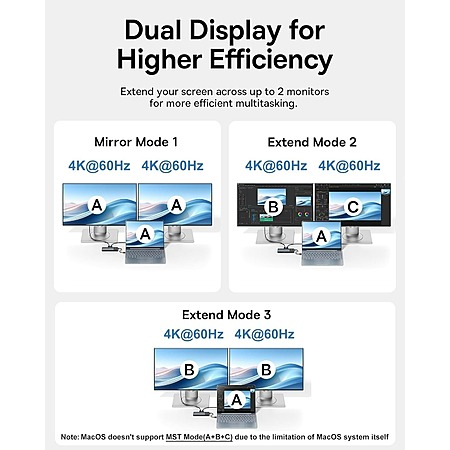 Dual Monitor Display with 4K High Refresh Clarity: Easily extend or mirror your screen via HDMI. Support single display output up to 4K@120Hz, or dual monitor docking station setups with both HDMI ports delivering up to 4K@60Hz each. Ideal for multitasking, content creation, and immersive visual experiences. (Actual resolution depends on host device and display capabilities.)