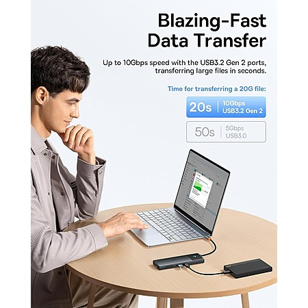 Super-Fast Data Transfer for Daily Efficiency: Equipped with USB 3.2 ports (1 USB-C and 1 USB-A) supporting data transfer speeds up to 10Gbps, allowing large files and images to transfer quickly. The SD/TF card reader supports reading speeds up to 104MB/s, enabling smooth access to photos, videos, and other important data.
