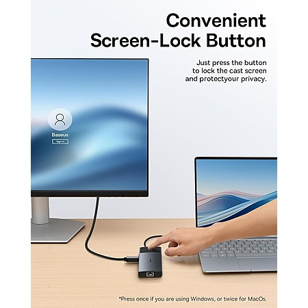 One-Touch Screen Lock for Added Privacy: With a single press, you can lock the cast screen to help protect personal or sensitive information without unplugging the hub. Convenient and user-friendly for both office and home use. Note: Press once for Windows systems, or twice for macOS systems.