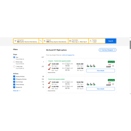 Asiana Airlines via Booking.com have round trip airfares travelling from Seattle (SEA) to Manila Philippines (MNL) for $597, making 1 stop Seoul Korea for varying number of hours both ways (between 2-16 hours). These are economy fares that allow a personal item, a carry-on bag and 2 free checked bags.