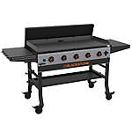 | Product Description: | Enjoy the ultimate outdoor cooking experience on the Blackstone 5-burner 44” Omnivore Griddle. With 935 square inches of cooking space and five independently controlled heat zones you’ll be cooking breakfast, lunch, and dinner for the entire neighborhood. Omnivore Griddle Plate Technology provides this griddle with more even heat distribution, better thermal shock stability, and less fuel use per cook so you can make mountains of food more effectively. Features including folding side shelves with side shelf tool hooks and a magnetic toolbar provide extra meal prep room and allow you to keep your favorite cooking tools on hand. When you are done using your griddle, place the included hard cover on the plate to protect it, fold down the side shelves, and use the handles and wheels to more easily move it to a better storage location. Whether you are feeding family and friends or hosting a large event, you can enjoy cooking for a crowd on the Blackstone 44” Omnivore griddle with hard cover. Blackstone Original 5-Burner 44" Omnivore Propane Griddle with Hard Cover Omnivore Griddle Plate Technology provides quicker preheat and recovery times, more even heat distribution, and better fuel efficiency Cook for a crowd with five independently controlled heat zones and 935 square inches of cooking space Folding side shelves with side shelf tool hooks and a magnetic tool bar help keep your spatulas, scrapers, and other cooking accessories on hand Patented Rear Grease Management system makes cleanup a breeze Folding side shelves, a hard cover, and four locking swivel caster wheels make storing and transporting your griddle easier Additional features include a pivoting paper towel holder and a bottle opener 47,500 BTUs - The Omni griddle plate requires fewer BTUs to maintain optimal cooking temperatures, using less propane per cook Model #2426 |