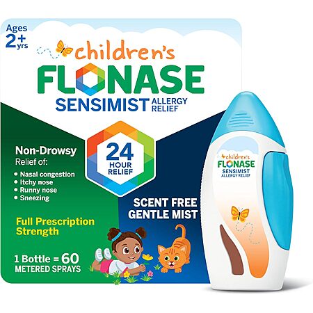 Children's Flonase Sensimist Allergy Relief Spray provides gentle, non-drowsy, long-lasting relief from allergy symptoms like nasal congestion, runny nose, itchy nose, and itchy and watery eyes(1) - all for a full 24 hours. This children's allergy medicine is a scent-free, alcohol-free fine mist that kids will barely notice. Offering full prescription strength, this allergy spray relieves symptoms caused by allergens such as pollen, mold, dust, and pet dander. Unlike single-ingredient antihistamine pills, chewables and syrups, it works directly in the nose to relieve nasal congestion caused by indoor and outdoor allergens. Perfect for allergy relief during Spring, back-to-school season, and Fall. It's easy to use: just one spray in each nostril once a day, formulated for children aged 2 to 11. Safe for daily use for up to two months - always check with your doctor after that. Help your little ones enjoy their day! (1) Children's Flonase Sensimist is indicated to treat itchy, watery eyes in children age 12+