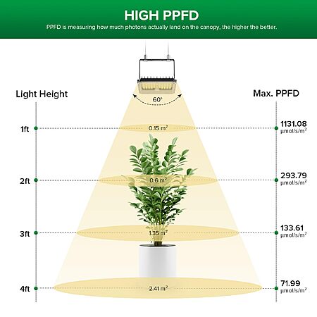 - Full Spectrum LED Grow Light: Spectrum range 380nm-780nm with 660nm red, 730nm infrared, 3000K warm white, and 5000K cool white light. PPFD: 1131.8 umol/m²/s @ 1ft. Ideal for promoting germination, blooming, and boosting plant production.