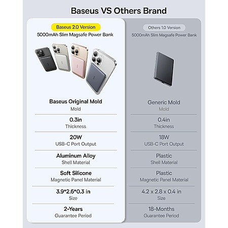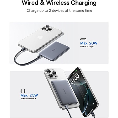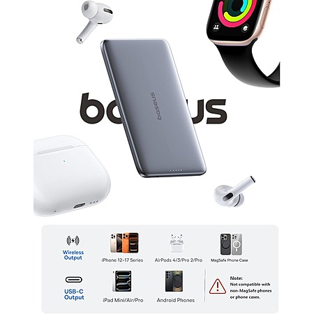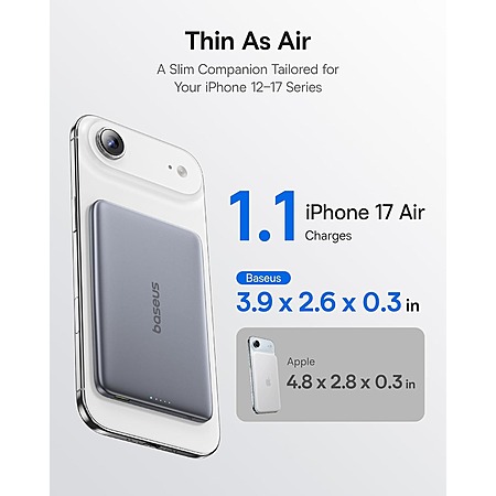 Model: Baseus Picogo Power Bank, 0.3" Ultra Slim 5000mAh MagSafe Portable Charger, Card-Size Magnetic Battery Pack with USB-C Braided Cable, Alloy Wireless Charger for iPhone 17 Pro Max/17 Air/16/15/14/13/12
