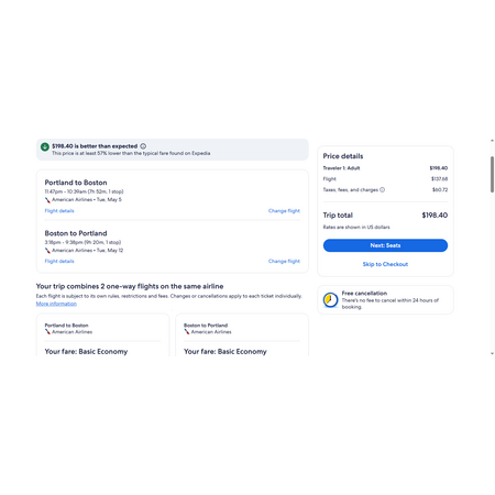 American Airlines, Southwest Airlines and Expedia have round trip airfares travelling to and from Boston (BOS) and Portland OR (PDX) for $199, making 1 stop both ways. These are basic economy fares. On American and Southwest, you are allowed a personal item and a carry-on bag.