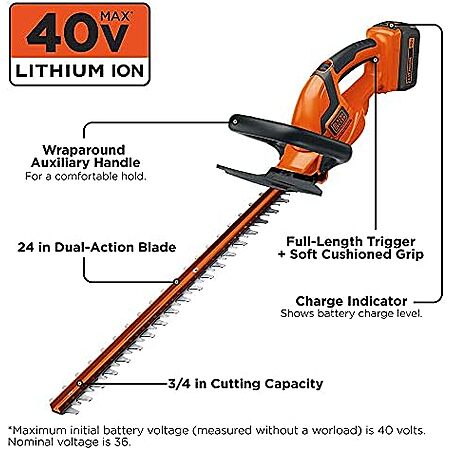 $79 | BLACK+DECKER 40V MAX Hedge Trimmer, Cordless, 24-Inch Blade, Battery and Charger Included (LHT2436) at Amazon