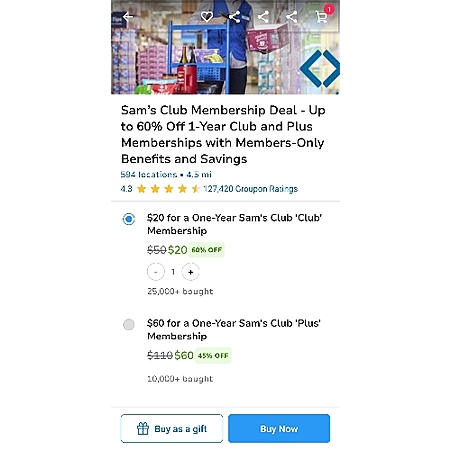 Sams Club Membership by Groupon, $20 For Basic, $60 For Plus.