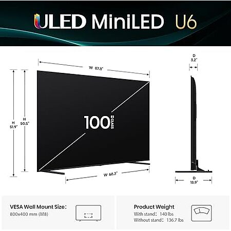 $1499.99 | 100″ Hisense U6 Series Best Value Mini-LED 4K UHD Smart HDR Gaming Fire TV (100U65QF, 2025 Model) at Amazon