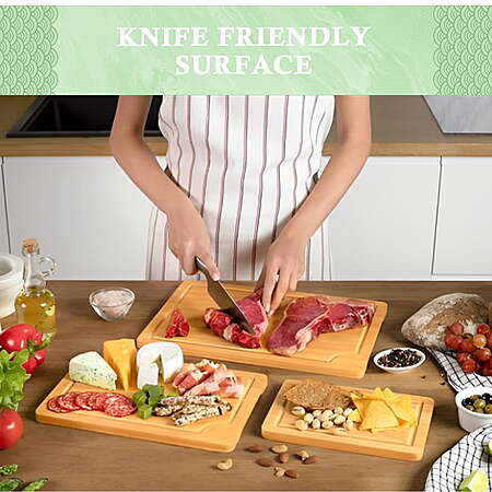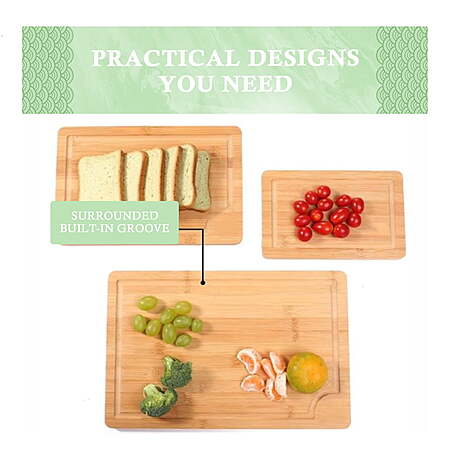 | Product Description: | AOKIWO Cutting Boards for Kitchen - 3 Packs Bamboo Cutting Board Set Our wood cutting board is made of minimally refined bamboo material to give you authentic quality you can count on. Durability: Bamboo is a strong and hard material, making it a durable option for cutting boards. It is less prone to warping, cracking, and splitting than some other materials. With a reversible large cutting board, you can use either side for different cutting tasks, making it a more versatile. One side of the board can be used for preparation, while the other side can be used for presentation, such as serving cheese or charcuterie The organic bamboo composition of these bamboo cutting boards provides a smooth surface for cutting while preventing your knives from going dull. Designed for effortless cleaning, simply hand wash. Cutting boards for kitchen use thanks to their deep grooved edges for catching meat and fruit juices Three Perfectly Size Seving Boards: Our bamboo cutting board, coming in a convenient set of 3, offer 9x6”, 12x8”, & 15x10” options, making this your all in one multipurpose use kitchen essential, allowing you to easily complete all of your cutting, meal preparation, and even serving needs. There’s an option for every need, small for quick fruit chopping, medium for more space or multiple vegetables, and large for slicing and dicing whole meat, rolling out dough, or even use as a charcuterie board. Built-in Size Handles: Designed for multipurpose use and easy handling, our wooden cutting board features built in carrying handles, so you’ll be able transfer ingredients to your stove without hassle. The chopping block can also be used as a serving tray or cheese platter, super easy to carry from kitchen to table, or be used to pass out finger foods at your next dinner party or event. You won’t have to worry about having butter fingers & dropping your food with these thoughtfully carved grips Knife-safe Gentle Surface: Our smooth bamboo wood is gentle on your knife blades, keeping them from quickly dulling, so you won’t have the extra kitchen task of often sharpening knives. The cutting boards for kitchen are easy and comfortable to strategically cut, slice, and dice on. With a special resin lacquer top coat around the wood to help prevent scarring, scratching, staining and other visible signs of wear, your set of kitchen boards will also be protected from collecting bacteria. No Mess Cutting & Transfer: These professional grade cutting boards can be used anywhere from industrial restaurant kitchens to your own home for daily cooking. Thoughtfully crafted with deep juice grooves, each of these chopping boards catch liquid runoff from meat, fruit, & other ingredients. Cleanup is a breeze without having to worry about spills and countertop messes. Additionally, you’ll easily be able to seamlessly transfer ingredients from your prep station to the stove for cooking. Money-back Warranty: AOKIWO is committed to providing our customers the best possible support and satisfaction. That’s why we offer a comprehensive customer support program with a 1-year warranty, a money-back guarantee, and 24/7 customer support. We understand the importance of standing behind our products and ensuring our customers are delighted. |