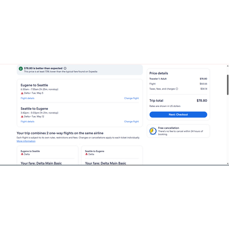 Delta Air Lines and Expedia have round trip airfares travelling to and from Eugene OR (EUG) and Seattle (SEA) for $79, nonstop. These are basic economy fares, a restricted-type fare. On Delta you are allowed a personal item and a carry-on bag. There is no seat selection and no change.