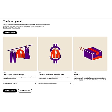 Trade In quiz [patagonia.com] or "Start Your Trade-In" for a more specific estimated credit value. Your exact credit will be determined after we receive and inspect each item.
