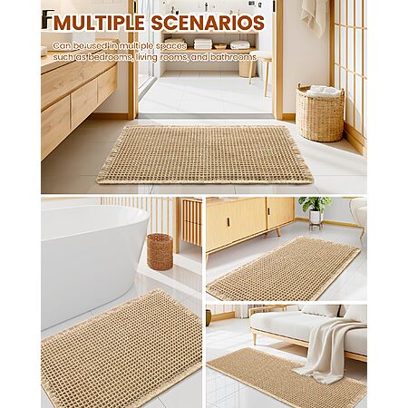 • [Non-Slip Backing]:The full-coverage hot melt adhesive backing on the bottom of the bathroom mat eliminates slipping risks through complete surface adhesion, keeps the mat flat without shifting, and evenly distributes pressure to reduce backing wear—combining safety protection, stable usability, and long-lasting performance in one.WARNING: Water under the bathroom rug can cause it to slip. Keep bottom of the bath rug dry!