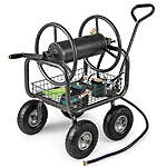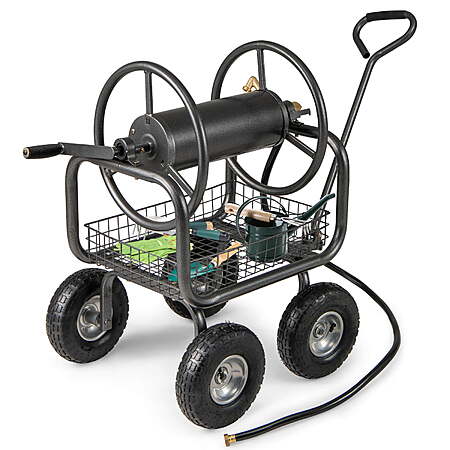 | Product Description: | Looking for a garden hose reel cart to make your outdoor tasks easier and more efficient? This high-quality garden hose reel cart features 10” pneumatic tires that provide enhanced traction and shock absorption, making it suitable for various road surfaces such as vegetable patches, fields, gravel roads, and grass. With a large capacity to hold 300 ft of 5/8” or 350 ft of 1/2” hose (hose not included), it is perfect for larger gardens and commercial spaces. The bottom storage basket keeps your gardening tools within reach, while the labor-saving crank handle makes winding and unwinding the hose quick and easy. Constructed from heavy-duty metal with brass fittings, this reel cart is designed to withstand frequent use without deforming or breaking. Whether you’re watering plants, irrigating farmland, washing cars, or even bathing pets, this versatile garden hose reel cart provides the perfect solution for a wide range of outdoor tasks. Feature Equipped with large pneumatic tires for enhanced traction and shock absorption Suitable for various road surfaces like vegetable patches, fields, gravel roads Can contain 300 ft of 5/8” or 350 ft of 1/2” hose for larger gardens and commercial spaces 6 FT 5/8” water inlet hose and brass fitting connector included Includes a bottom storage basket to keep gardening tools within easy reach Versatile for watering plants, irrigating farmland, washing cars and bathing pets Features a crank handle for quick and easy hose winding and unwinding Soft foam handrail allows you to pull the cart anywhere effortlessly Constructed from heavy-duty metal to withstand frequent use without deforming Brass fittings provide secure and leak-proof connections Rust-resistant design for long - lasting durability in outdoor environments Assembly required Specification Color: Gray Material: Metal, Brass Product Dimensions: 25” x 21.5” x 43” (L x W x H) Tire Diameter: 10” Storage Basket Size: 21.5” x 15” x 3.5” (L x W x H) Hose Capacity: 300 ft of 5/8” or 350 ft of 1/2” hose Inlet Hose Length: 6 ft Net Weight: 39.5 lbs Package Includes: 1 x Garden Hose Reel Cart 1 x Inlet Hose 1 x User’s Manual Quality Pneumatic Tire: Equipped with 10” wear-resistant and non-slip pneumatic tires, this garden hose reel cart provides enhanced traction and shock absorption. This cart is suitable for various road surfaces such as vegetable patches, fields, gravel roads and grass. Large Capacity & Extra Storage: This hose organizer can contain 300 ft of 5/8” or 350 ft of 1/2” hose (hose not included) for larger gardens and commercial spaces. Plus, it includes a bottom storage basket to keep your gardening tools within reach. Suitable for Various Scenarios: This versatile garden hose reel cart is suitable for a wide range of outdoor tasks. Whether you’re watering plants, irrigating farmland, washing cars, or even bathing pets, it provides the perfect solution. Quick & Easy Operation: No more worry about messy hoses in your yard, the garden hose reel cart features a labor-saving crank handle that makes winding and unwinding the hose quick and easy. Besides, the soft foam handrail allows you to pull the cart anywhere easily. Heavy-duty Structure: Constructed from heavy-duty metal, this reel cart is designed to withstand frequent use without deforming or breaking. Additionally, the brass fittings provide a secure and leak-proof connection, ensuring reliable performance and rust resistance. |