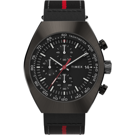 • The striking appearance of our Timex Legacy Tonneau Chronograph draws inspiration from the iconic watch styles of the '70s. Its sizeable 42mm barrel-shaped stainless-steel case has a lug-to-lug width of 46mm, and houses a round opening with an elaborate, multi-layered black dial with a date window as the 3 o'clock marker. Intricate detailing on the crown and case sides paired with integrated hidden lugs bring this polished timepiece even more sophistication, while the two-piece recycled fabric strap with leather tabs at the spring bars completes its handsome profile.