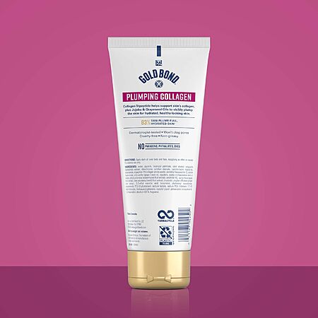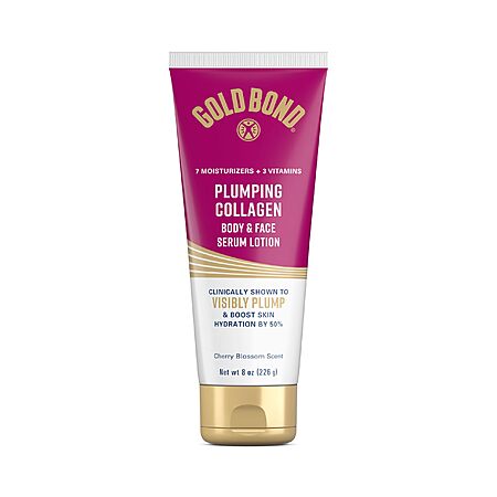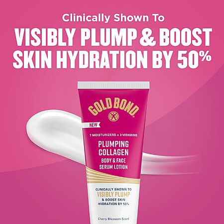 - Transform your day or nighttime skincare routine with Gold Bond Plumping Collagen Body and Face Serum Lotion. This moisturizing serum lotion is clinically shown to instantly plump skin and increase moisture levels by 50% leaving your dry skin feeling hydrated. Each tube features collagen tripeptides jojoba and grapeseed oils to visibly plump and firm skin for up to 72 hours with 83% agreeing skin looks plumped*. The lightweight formula also doubles as a skin barrier with 7 moisturizers plus vitamins B C and E to lock in hydration. Feel confident knowing this formula is free from parabens phthalates dyes and animal-derived ingredients. Experience visibly plumper firmer and beautifully hydrated skin with Gold Bond Plumping Collagen Serum Lotion. *After 2 weeks
