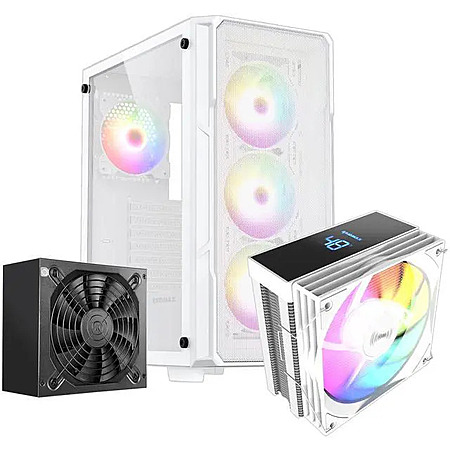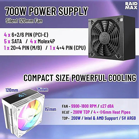 All-in-One Gaming PC Case Bundle Includes mid tower case, 700W PSU, and RAIDMAX AM1204 ARGB CPU cooler with real-time digital display.
