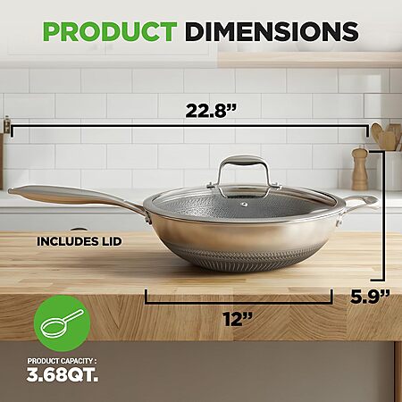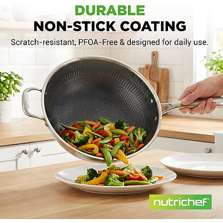 Model: NutriChef 12" Stainless Steel Wok - Induction ready, Non Stick Tri-ply technology, Scratch-resistant Honeycomb Fire Textured Pattern