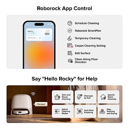 • Roborock App: The Roborock App is packed with powerful features. Beyond standard controls, it includes SmartPlan 2.0, which learns your cleaning habits and adapts to different room types and floor surfaces for smarter, more efficient cleaning tailored specifically to your home.