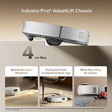 • Industry-First AdaptiLift Chassis: The Roborock AdaptiLift Chassis technology brings a new level of versatility, allowing the robot to lift its entire chassis to 4cm max or adjust individual sections—front, rear, left, or right—based on the terrain. Whether tackling high thresholds or effortlessly maneuvering around furniture legs, it adapts seamlessly to your home's layout, enabling smooth, uninterrupted cleaning. (roborock was the first in the robot vacuum industry to mass-produce a product featuring a liftable chassis system with three-wheel control, officially launching this technology in Q3 2024.)