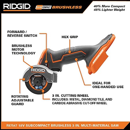 | Product Description: | RIDGID introduces the 18V SubCompact Brushless Cordless 3 in. Multi-Material Saw Kit with (3) Cutting Wheels, 2.0 Ah Battery, and 18V Charger. This 18V SubCompact Brushless Cordless 3 in. Multi-Material Saw delivers multi-material cutting capability in an ergonomic package, optimized for 1-handed use. The Brushless Motor offers more runtime and longer motor life. All RIDGID 18V SubCompact Brushless tools, including this multi-material saw, are 100% compatible with all RIDGID 18V tools and batteries. The included 2.0 Ah Battery and 18V Charger are compatible with all RIDGID 18V Tools. This kit is backed by the Industry's Only Lifetime Service Agreement, simply register within 90 days of purchase for FREE Parts, FREE Service, For LIFE. The 18V SubCompact Brushless Cordless 3 in. Multi-Material Saw includes a metal cut off wheel, a diamond tile wheel, a carbide abrasive wheel, rotating upper guard, adjustable wire guide, LED light, hex key, a 2.0 Ah Battery, an 18V Charger, and an operator's manual. |