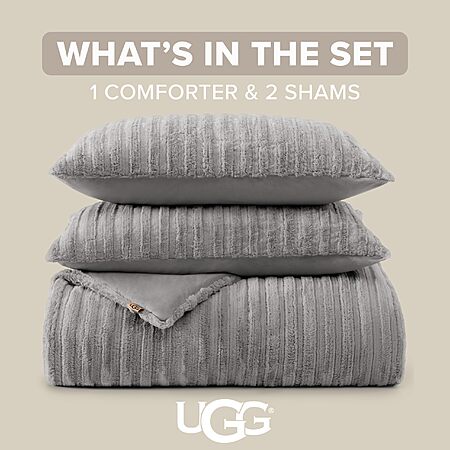 - Plush Faux Fur Grey Comforter: Elevate your bedroom with the ultra-cozy UGG Kenzie Comforter Set. Made with luxuriously soft, subtly striped faux fur, this warm and thick blanket set adds both comfort and a stylish decorative touch to your bedroom.