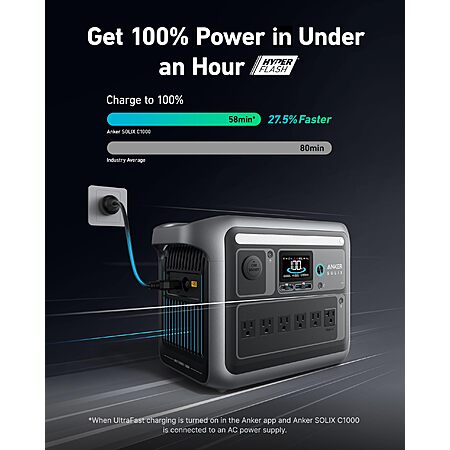 AnkerDirect via Amazon[amazon.com] has Anker SOLIX C1000 1056Wh 1800W LiFePO4 Portable Power Station w/ 100W Solar Panel on sale for $619.99 - additional $92 off w/ code ANKERC1000 at checkout = $527.99. Shipping is free.